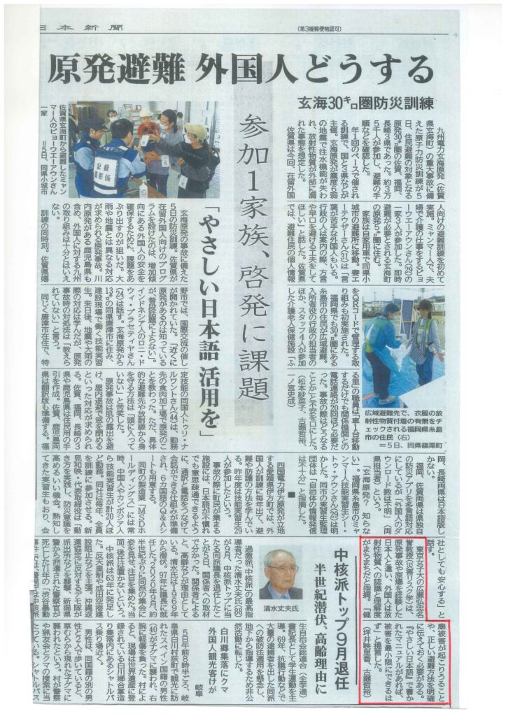 2025年10月6日西日本新聞「九州電力玄海原発の過酷事故の場合外国人旅行者は避難できない」 2025年10月17日 2025年10月6日西日本新聞「九州電力玄海原発の過酷事故の場合外国人旅行者は避難できない」(🔍クリックして拡大) 災害リスク学玄海原発西日本新聞 Prev Post 福岡高裁、川内原発の再稼働を容認-手続論に終始し、リスクの根源に踏み込まず-西日本新聞8月28日 2025年9月1日 関連記事 福岡高裁、川内原発の再稼働を容認-手続論に終始し、リスクの根源に踏み込まず-西日本新聞8月28日 2025年9月1日 神奈川新聞2025年8月8日、津波避難時の交通混乱を防ぐため自治体による優先避難車輌の指定も一案 2025年8月27日 2006年の警告―20年前のアスベストと20年後の原発―リスク軽視社会―11.29日刊工業 2025年8月20日