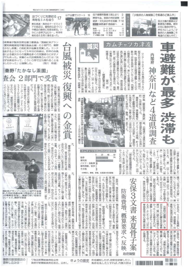 12月29日神奈川新聞コメント「カムチャツカ地震で津波避難者の6割が車を利用して混乱した。」 2026年2月19日 12月29日神奈川新聞コメント「カムチャツカ地震で津波避難者の6割が車を利用して混乱した」(🔍クリックして拡大) 災害リスク学神奈川新聞避難手段 Prev Post 2025年12月17日東京新聞朝刊「熊との出合いを恐れて災害時に避難行動をためらうのは本末転倒」 2025年12月17日 Next Post 12月26日毎日新聞朝刊「大津地裁は関西電力3原発の稼働を容認した。複合災害リスクを無視。」 2026年2月19日 関連記事 12月26日毎日新聞朝刊「大津地裁は関西電力3原発の稼働を容認した。複合災害リスクを無視。」 2026年2月19日 2025年12月17日東京新聞朝刊「熊との出合いを恐れて災害時に避難行動をためらうのは本末転倒」 2025年12月17日 2025年10月25日プレジデントオンライン「日野行介氏と対談-原発再稼働の為の政府のインチキ 2025年10月31日